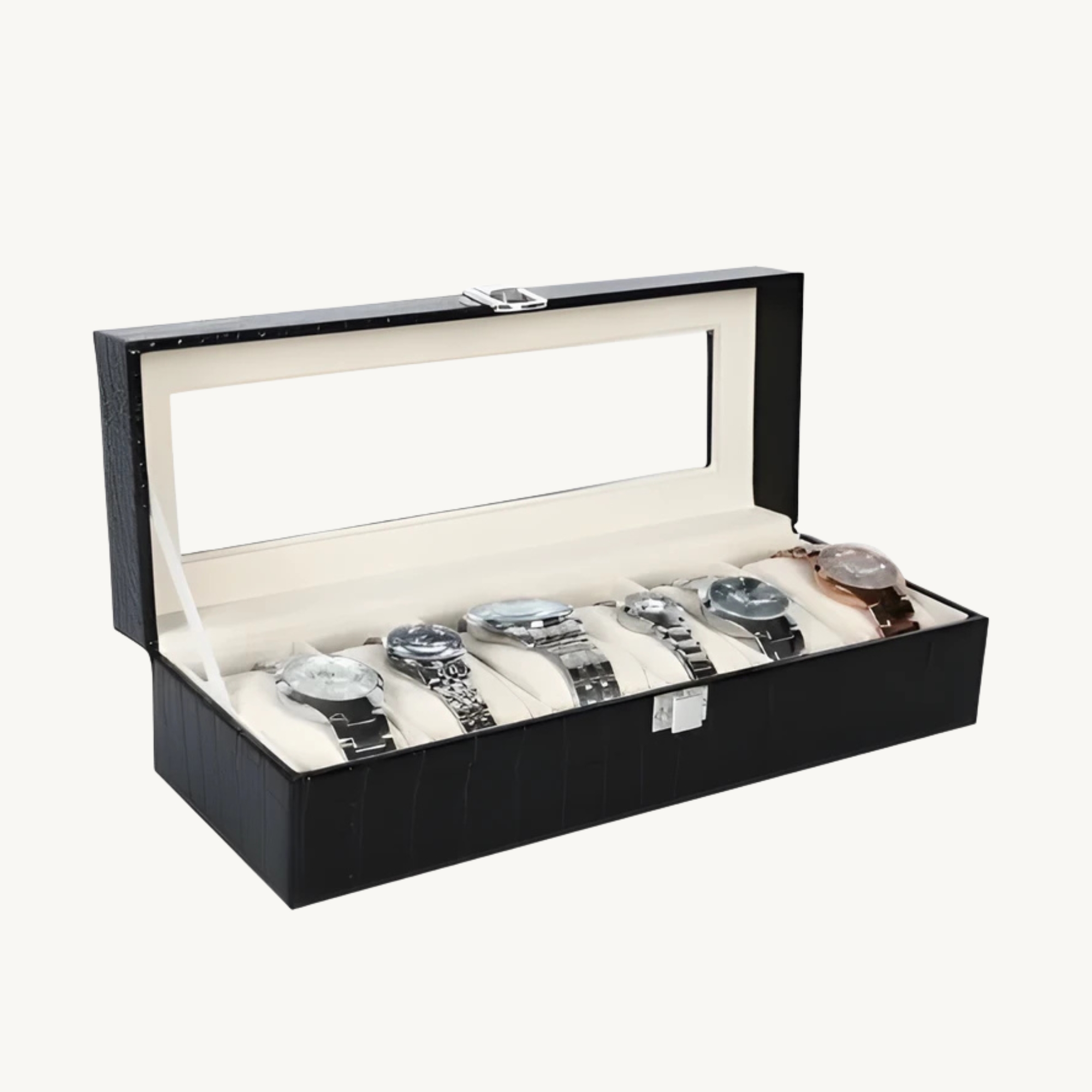 Capacidade: acomoda até 6 relógios, com nichos individuais acolchoados