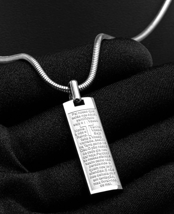 O colar Oração Pai Nosso é todo em aço. Possui um design moderno e inovador. A oração do Pai Nosso é minimalista.