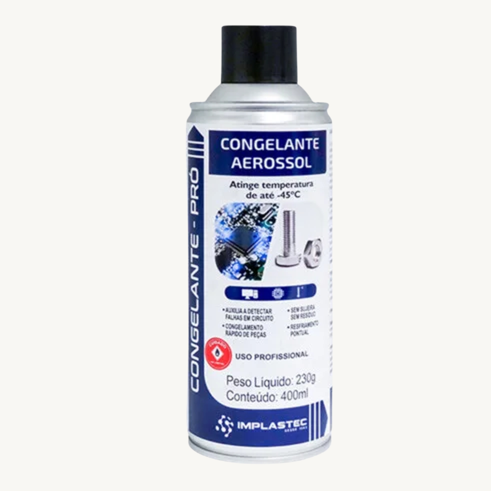 O Congelante Aerossol Implastec pode ser usado em identificação de falhas de componentes em circuitos eletrônicos, montagem de pequenos rolamentos e/ou engrenagens em eixos resfriados.