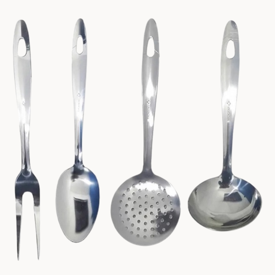 Kit 04 pçs Utensílios Para Cozinha de Aço Inox Escumadeira, Garfo p/ Churrasco, Concha, Espátula