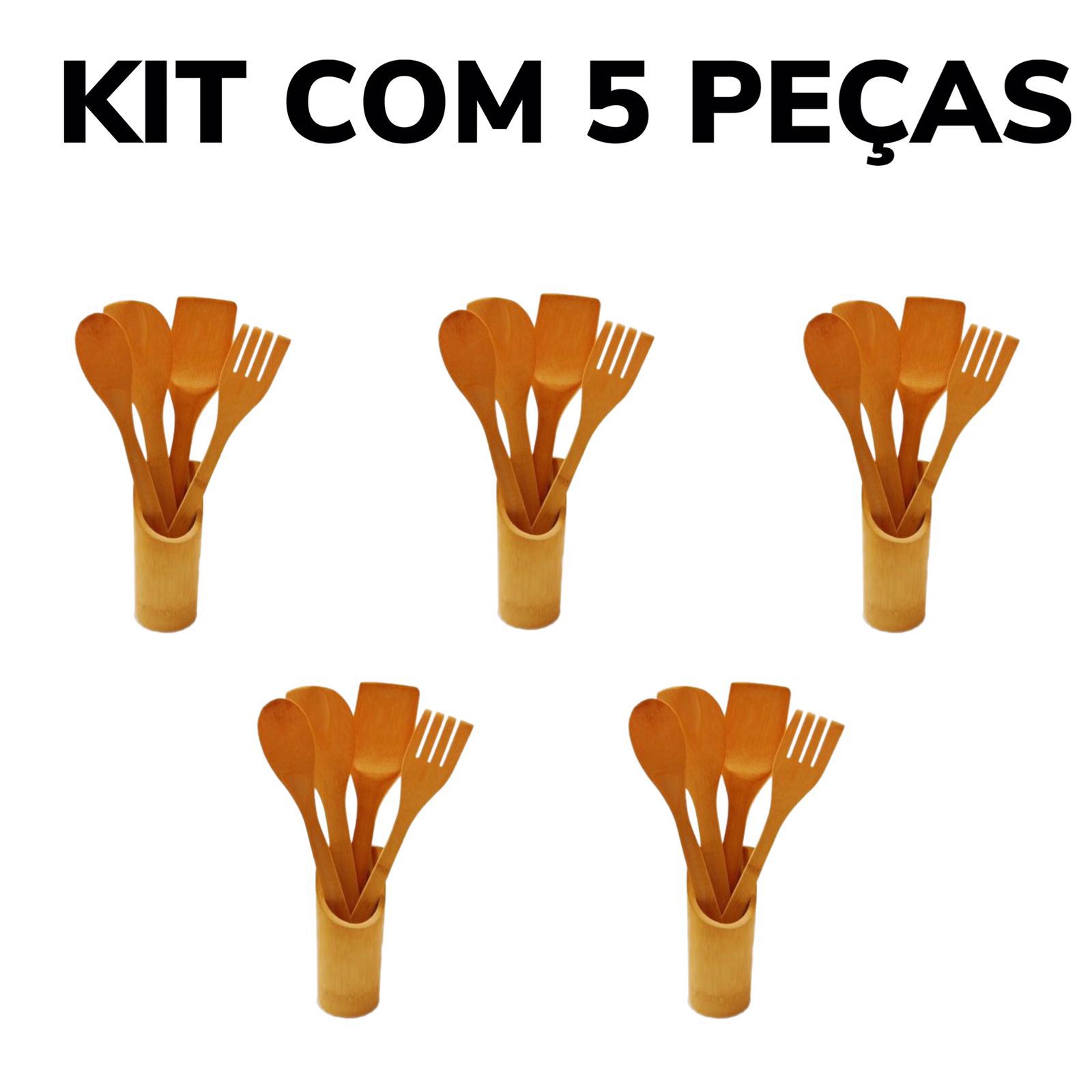 Kit 5 Conjuntos Talheres De Bambu com 5 peças (4 talheres + suporte) Peças Anti Fungos - KCB-06